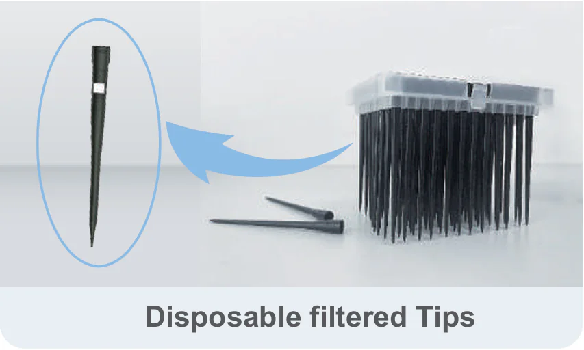 - Integrated packaging of disposable filtered Tips ensures no cross-contamination and low failure rate, and avoids aerosol pollution